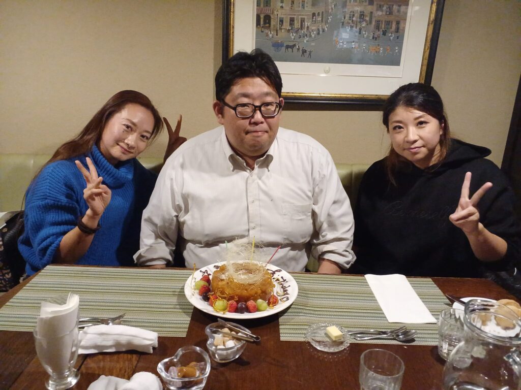 この誕生日ケーキ、お店を予約するときに自分で頼んだんだけど、誕生日が近いからということで、サプライズで頼んだらしい。まぁ、自分で頼んでいたので、サプライズでもなんでもないんだけど。あぁ、支払いは2人になった。ご馳走様でした。